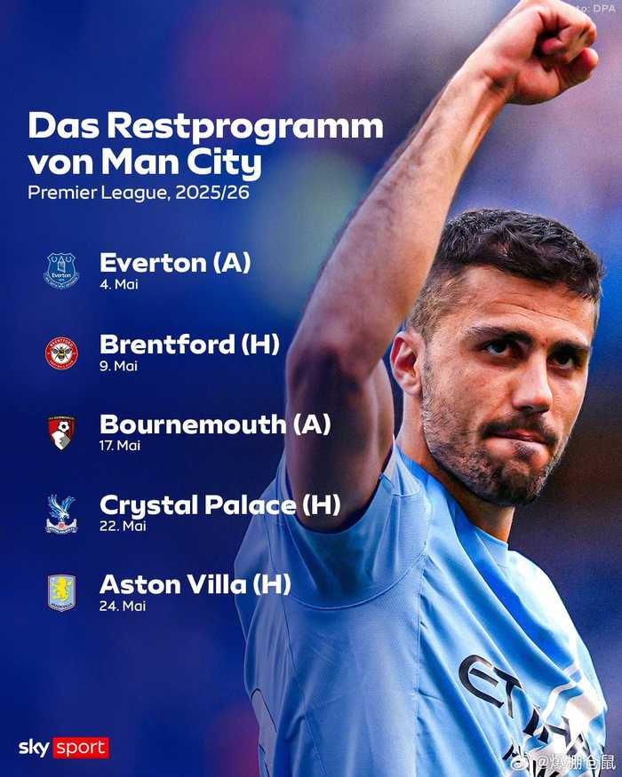 >曼城阿森纳同分争冠,最后5轮赛程出炉